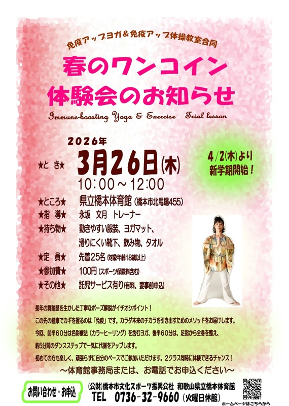 免疫アップ・ヨガ 休講:2026年1月29日(木)→振替日:2026年3月19日(木)