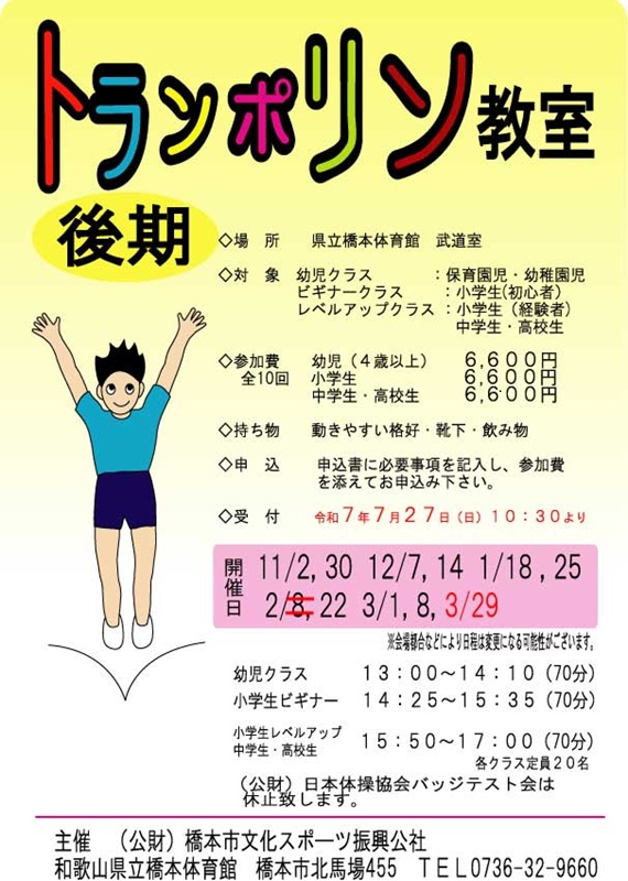 トランポリン教室 休講:2026年2月8日(日)→振替日:2026年3月29日(日)
